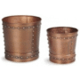 Add a bold, rustic-industrial element to your decor with this set of two metal planters. Finished in a rich, antique copper tone, this duo features a design inspired by industrial metalwork. Each pot is adorned with two horizontal bands of raised studs (or rivets), one near the rim and one at the base, giving them a strong, tactile, and vintage character.